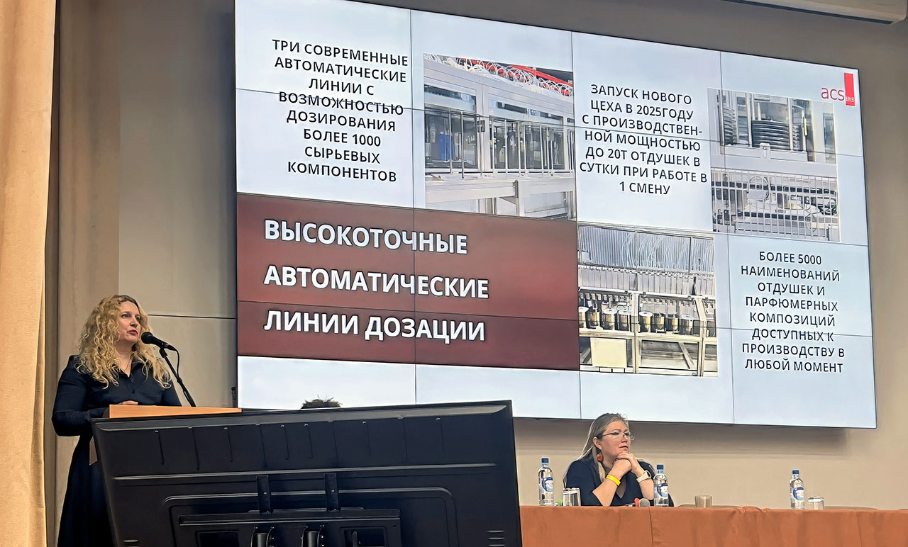 Центральным событием для ACSens стало выступление Анны Сапрыкиной, директора парфюмерного направления. В своем докладе она не только представила компанию как мощного игрока на рынке сырья, но и детально осветила наши возможности по замещению зарубежных аналогов.